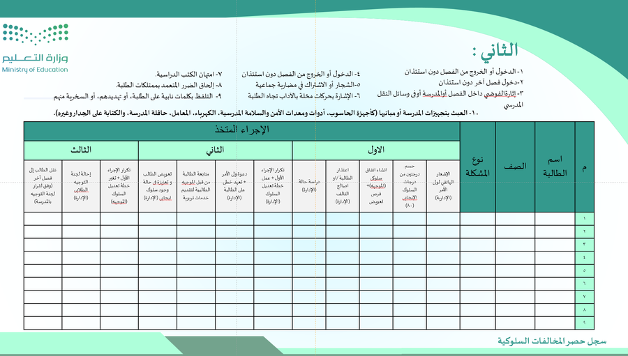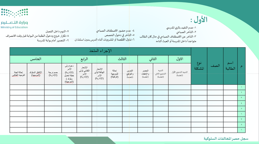 يوفر سجل حصر المخالفات السلوكية نظامًا متكاملًا لتسجيل بيانات الطالب، نوع المخالفة، تاريخها، الإجراء المتخذ، والملاحظات.
